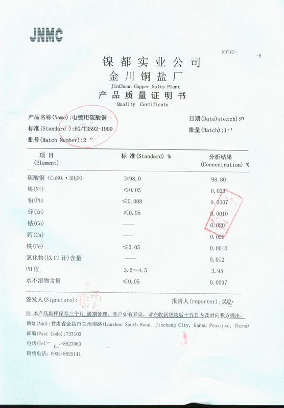 簡介:金川硫酸銅,主要用于電鍍銅、化學(xué)鍍銅;化學(xué)工業(yè)中是制取其它銅鹽的重要原料,用于制造染料、媒染料劑、顏料、防腐劑、農(nóng)藥。