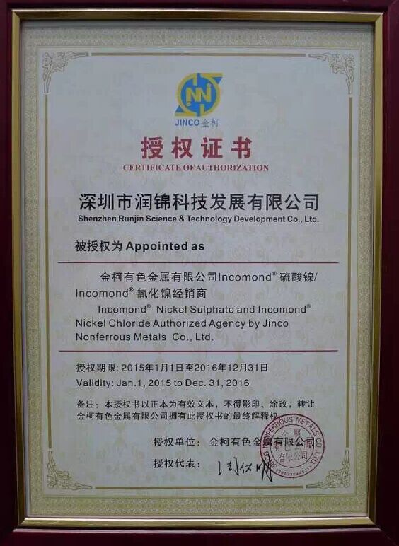 深圳市潤(rùn)錦科技發(fā)展有限公司作為金柯有色金屬有限公司廣東地區(qū)總代理商,現(xiàn)倉(cāng)庫(kù)有充足金柯硫酸鎳、金柯氯化鎳,可滿足廣大客戶在高端鍍鎳工藝上的需求。歡迎有需求的客戶朋友與業(yè)務(wù)員洽談?dòng)嗀?,我們期待您的來電和光臨!