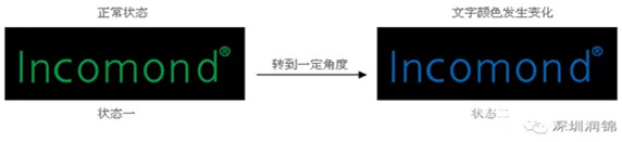 肉眼直接觀察防偽標(biāo)簽時(shí),Incomond正視為綠色,轉(zhuǎn)動(dòng)約50度視角之后,直接變?yōu)樗{(lán)色I(xiàn)ncomond